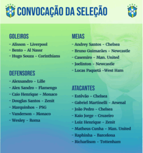 O técnico Carlo Ancelotti fez, nesta segunda-feira, sua segunda convocação na seleção brasileira. O Brasil enfrenta o Chile no Maracanã no dia 4 de setembro e fecha as Eliminatórias no dia 9, fora de casa, contra a Bolívia. Ao todo, foram nove novidades: Caio Henrique, Douglas Santos, Fabrício Bruno, Gabriel Magalhães, Joelinton, Paquetá, João Pedro, Kaio Jorge e Luiz Henrique.