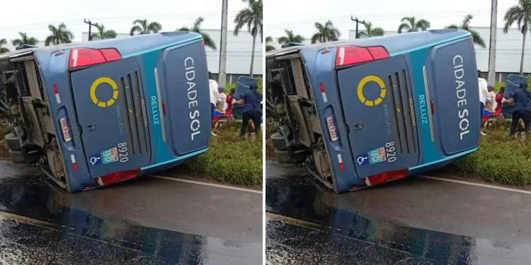 O veículo tombou no canteiro central, entre as duas pistas no trecho Salvador – Feira de Santana Um ônibus tombou