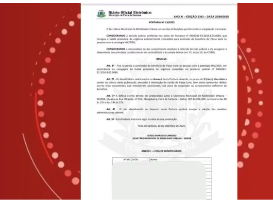 Caso aconteceu em Feira de Santana, segunda maior cidade da Bahia. Documento foi publicado no sábado (20) e retirado do